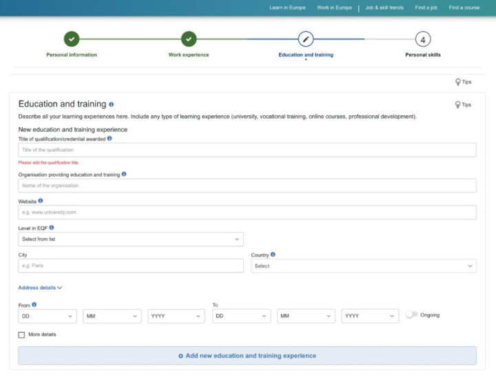 - قم بتخصيص Europass CV لكل طلب وظيفة: يتيح Europass التخصيص السريع من خلال تمكينك من تحديد الأقسام والإنجازات الأكثر صلة بكل دور.