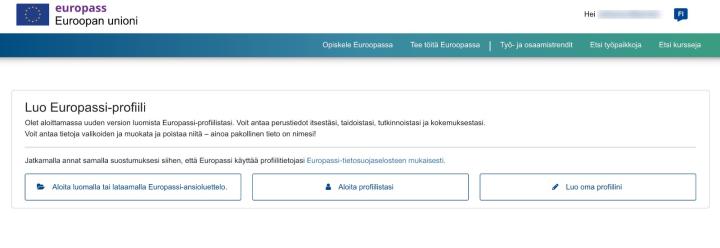Europass ansioluetteloa varten kannattaa ensin luoda Europass-portaalissa oma profiili. CV:n luominen on mahdollista myös ilman profiilia, mutta profiilin luominen on kuitenkin kätevää, sillä voit käyttää samoja tietoja useaan kertaan luodessasi CV:n, ja lisäksi tietosi ovat tallessa Europass-palvelussa.