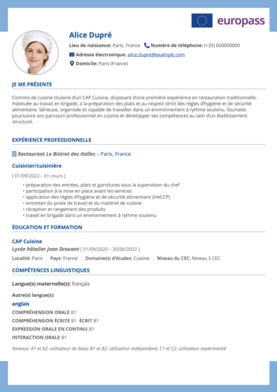 Ce format présente un avantage certain pour les candidatures internationales ou les démarches administratives, mais il laisse peu de place à la personnalisation graphique. La mise en page reste sobre, fonctionnelle, et identique d’un candidat à l’autre.