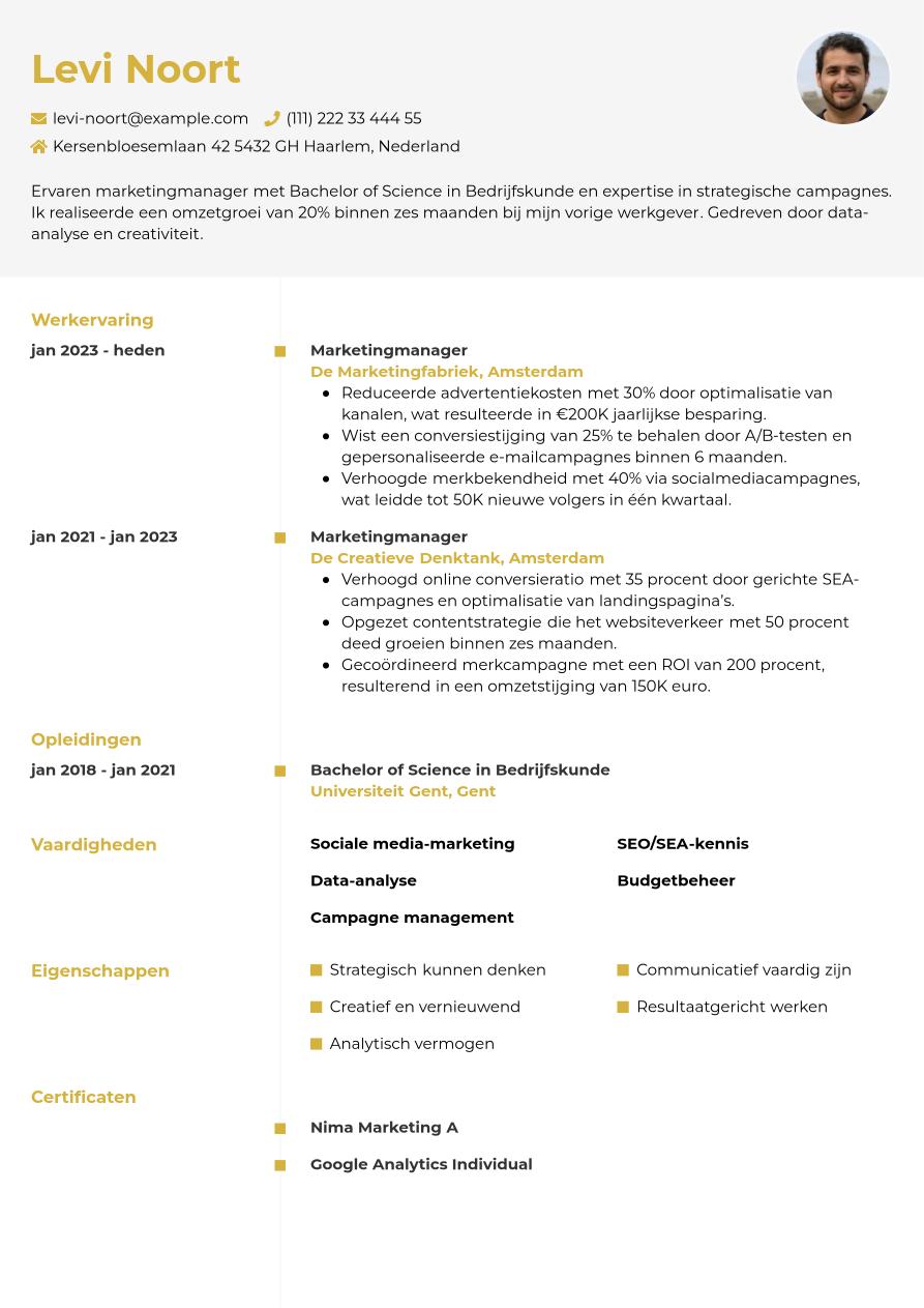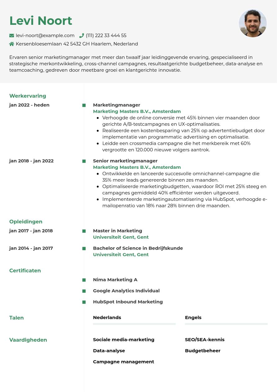 Kwantificeer de effecten van je werk waar mogelijk. Cijfers geven namelijk concreet bewijs van je impact en maken je prestaties vergelijkbaar. Bijvoorbeeld: +35% meer websiteverkeer, 150 leads per maand, 95% klanttevredenheid. - Focus op relevantie per functie