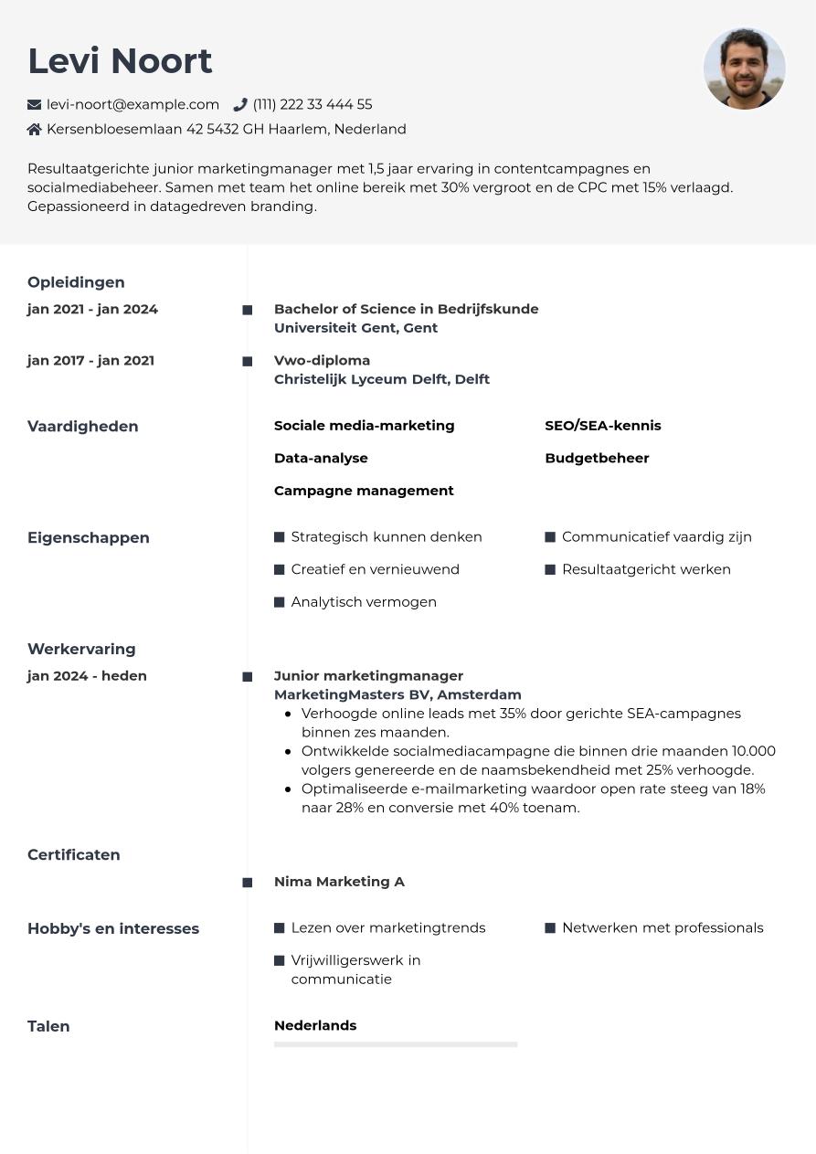 - Bijbanen en nevenwerk: Ook tijdelijke of deeltijdbanen zeggen iets over jou. Denk aan klantcontact, samenwerken, verantwoordelijkheid of omgaan met tijdsdruk, zoals ons cv-voorbeeld eerder in dit artikel ook al liet zien. Benoem op je cv welke vaardigheden je daar ontwikkelde en toepaste.
